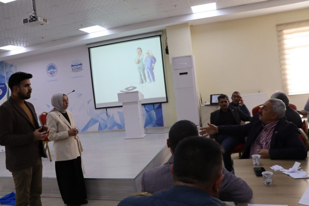 Kayseri Mesleki Eğitim ve Kültür A.Ş.’nin (KAYMEK) Huzur Çınarı Aile Danışmanlık ve Rehberlik Merkezi birimi uzmanları, yürütülen eğitimlerde muhtarlarla buluşuyor.
