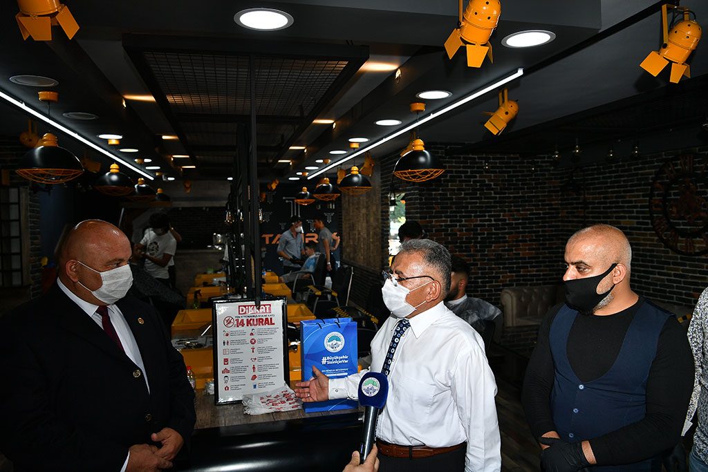 Büyükşehir Belediye Başkanı Memduh Büyükkılıç, daha sonra da sertifika alan erkek berberinde incelemelerde bulunarak, şunları söyledi ; “Gayet nezih bir ortamdayız. Girer girmez kurallara uyan bir yer olduğu belli oluyor. Görüyorum ki burada çalışan kardeşlerimiz kurallara gayet uyuyor” diye konuştu.